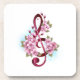 Pink treble clef with delicate, detailed pink Japanese cherry blossoms against white background painted over with light blue paint. Blooming pink sakura.