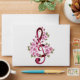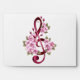 Pink treble clef with delicate, detailed pink Japanese cherry blossoms against white background painted over with light blue paint. Blooming pink sakura.