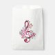 Pink treble clef with delicate, detailed pink Japanese cherry blossoms against white background painted over with light blue paint. Blooming pink sakura.