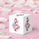 Pink treble clef with delicate, detailed pink Japanese cherry blossoms against white background painted over with light blue paint. Blooming pink sakura.