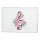 Pink treble clef with delicate, detailed pink Japanese cherry blossoms against white background painted over with light blue paint. Blooming pink sakura.