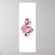 Pink treble clef with delicate, detailed pink Japanese cherry blossoms against white background painted over with light blue paint. Blooming pink sakura.