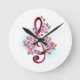 Pink treble clef with delicate, detailed pink Japanese cherry blossoms against white background painted over with light blue paint. Blooming pink sakura.