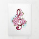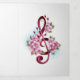 Pink treble clef with delicate, detailed pink Japanese cherry blossoms against white background painted over with light blue paint. Blooming pink sakura.