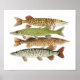 Art poster of a Muskellunge,Tiger Muskie,Northern Pike & a Chain Pickerel by nature artist Thom Glace