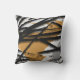 Modern throw pillow features a stylish artistic design in a mustard and black colour palette with grey accents. This artistic composition is constructed from an artistic woodblock design, layered over Memphis style design elements; layered design elements create highlights and shadows. The shades of grey with black accents complement the golden mustard yellow background.