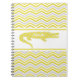 It's easy to personalise this colourful chevron stripe and mustard yellow gator notebook with a name before ordering! Features mustard yellow, white, and grey chevron stripes with a mustard yellow and grey polka dotted alligator and an area you can easily customise with a name!