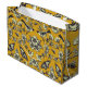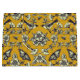 This gift bag features birds, flowers, bees, and butterflies in navy blue and cream on a mustard yellow background.
