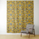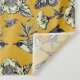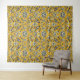 This tapestry features birds, flowers, bees, and butterflies in navy blue and cream on a mustard yellow background.