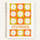 This personalised notebook features a retro floral design with white daisies on mustard yellow and orange chequerboard background. Personalise the name.