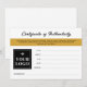 Modern personalised certificate of authenticity with a modern signature script and minimalist fonts. Sign it by hand and add title, medium, dimensions, date etc along with either your logo or a photo of the artwork. One sided certificate of authenticity card with modern fonts, your logo against a white background and your custom disclaimer and copyright text in black against mustard yellow. Certificate of authenticity for your artwork so that your customers and patrons know the artwork they've purchased is an original you can hand-write the details on before signing by hand.