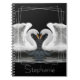 Nature photography was digitally enhanced to create a mirror image of a mute white swan. There is a heart shape created where the two swans meet. The white swan is against the ripples in the blue water and a black background. There is a geometric frame around the swan image.
