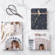 These beautiful Christmas wrapping paper sheets feature a festive selection of muted taupe circular boho shapes and rainbows with touches of faux gold, your personalised photo, and one with a midnight blue faux gold dot print.