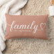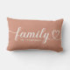 A personalised muted clay lumbar pillow featuring Family in flowing white heart script with a customisable last name monogram. The white-on-clay design brings a warm, earthy terracotta accent to living rooms, bedrooms, or boho-styled spaces. All text is fully editable to personalise with your family surname. A beautiful housewarming or family gift.