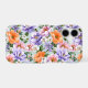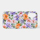 Muted watercolor style flower pattern of pink, orange, lavender flowers with green leaves on a mint background.