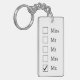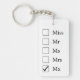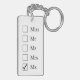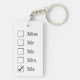 A double-sided keychain with a list of titles (Miss, Mr, Ms, Mrs and Mx). Mx has a tick in the box next to it. Mx is a gender-neutral title which is popular for non-binary gender people.