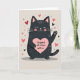 This card shows a round black cat on a soft cream background, looking calm with closed eyes and a small smile. The cat has pink cheeks, a pink nose, and pink inner ears, and it’s holding a big light-pink heart close to its chest ❤️. On the heart, the message “i’d spend all 9 lives with u” appears in simple, lowercase lettering that’s easy to read and centered. Around the cat, small hearts in red and pink float in the air along with tiny crosses and dots, like little love notes scattered around 💌. One paw is lifted as if the cat is waving, and you can see a tiny pink paw pad. The whole design has a light speckled texture that makes it feel cozy and handmade, like something you’d pair with a small treat 🍫.