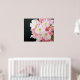 Delicate pink blossoms cluster together with soft petals and vibrant yellow centres, set against a dark background that enhances their vividness. The composition captures the flowers in full bloom, showcasing their intricate details and natural beauty.