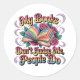 A vibrant and colourful retro-style design showcases an open book, roses, crescent shapes, and stars. The bold text reads, "My books don't judge me, people do." This unique design is available on a wide range of products.