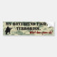 My Boyfriend Fights Terrorism . What does yours do? Funny patriotic military bumper sticker with soldier and gun on camouflage.