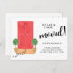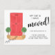 This moving announcement postcard features a red door and pot plants with kitty paw prints and stylish typography.