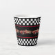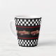 Here’s a stylish latte mug that stars a red vintage Corvette. Set on a black background, this design has a black and white chequered border on the top and bottom, of the mug. In the centre, there’s a row of the same Corvette image.