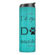 The perfect tumbler for those who prefer to stay home with their dog instead of going out. Thermal tumbler design features text that says "I'd go...but my dog wouldn't allow it." with a paw print and dog silhouette embellishment against a teal wooden background. Additional gift items available with this design as well.