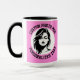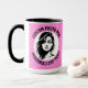My Face on a large custom Combo Mug, 15 oz., 3.4" diameter x 4.5" high, with CARNATION PINK #FF8AD8 background and COLLEGE text font. (A combo mug has black, hunter green, maroon, navy blue or yellow handle + inside). Custom photo and personalized text template with two individually customized design areas (see store for more background colors, font styles, and alternative template options).