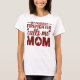 This White t-shirt features the text "- MY FAVORITE -" at the top in a small red font, above the word "FIREFIGHTER" in a larger, bold red font. Below, "calls me" is written in a red script font, and at the bottom, "MOM" is displayed in a large, bold red font with a subtle flame design incorporated into the "O." Small red hearts accent the word "calls." This shirt expresses pride in having a firefighter as a child.