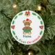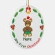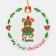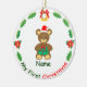 A teddy bear wearing a Santa hat and holding a Christmas present with a Christmas wreath, and a message of “My First Christmas" to celebrate your baby's first Christmas.