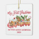 Modern Brush Script My First Christmas Baby Ornament includes Watercolor Gingerbread Train with candy, cookies and pines.