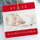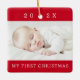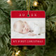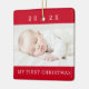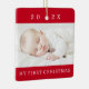 Red, ceramic ornament featuring your custom photo, the year and custom text "My first Christmas".