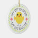 Easter ornament featuring a cute cartoon chicken and two pink flowers. Around is a yellow and green border of radial dots. Text "My first Easter".