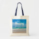 My Happy Place is a beautiful beach with a clear blue sky and soft sand on my toes. This design features a classic tote bag with a navy handle.