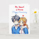 A sweet Happy Anniversary card depicting an anime boy and girl couple in blue and red. On back is a colouring page where you can personalise the names. Anniversary card for him or her.