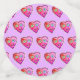 A smiling, contemporary art style emoji as a red heart shaped emoticon face in the bright, colourful Valentine colours of red, pinks, magentas and purples accented with other complementary colours.
