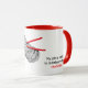 A customisable mug for a keen crocheter with the words "My job is starting to interfere with my crocheting" and decorated in black and red with a skein of wool and two crochet hooks.