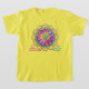 Cool T-Shirt with a pretty mandala design (like kids used to make with a spirograph). In bright and cheerful colours (hot pink, turquoise, lime green, and yellow). Text: "My name is (recipient's name) and this is my Mandala.". Custom text field waiting for you to fill in name. Original digital painting by Leslie Sigal Javorek.