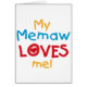 My Memaw Loves Me T-shirts, bodysuits, cards, stickers, tote bags, magnets, stickers, and other Memaw Loves Me apparel and gifts with a blue, red, and yellow text design.