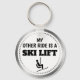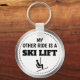 My other Ride is a Ski Lift in black uppercase mixed font with an icon image of a person on a ski-lift. Set on white and two tone silver grey background.