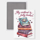 A cosy book lover quote celebrating weekends spent reading. Decorative stacked books with hearts create a warm and relaxed reading mood for people who love quiet time with stories.