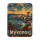 A serene and nostalgic portrayal of Mykonos, the iconic Greek island known for its whitewashed buildings and vibrant blue domes. The design captures the island's picturesque coastal views, charming streets, and the timeless beauty of its architecture, all illustrated in a vintage style. This artwork embodies the relaxed, sun-soaked charm of Mykonos, inviting viewers to experience its unique allure.