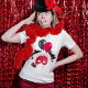 White basic t-shirt with a cabaret image of a red feathered mask, red and black balloon, ruby heart, and black sequin heart. See the entire Cancan Apparel collection in the PARTY FAVORS section.