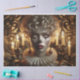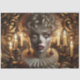 A captivating and enigmatic harlequin woman, staring forward with bright, hypnotic eyes that seem to pierce through the veil of reality. Her porcelain-like face is adorned with classic yet surreal harlequin markings—sharp diamond patterns, smudged theatrical paint, or delicate filigree designs that shimmer in the light. Her lips are painted in a deep, dramatic hue, slightly parted as if she holds an untold secret.