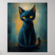 A stylized digital painting of a black cat with piercing yellow eyes, seated against a moody abstract background of teal, blue, and orange. The expressive brushstrokes and shadowy tones evoke mystery and elegance. This piece blends realism with atmosphere, perfect for lovers of feline art and dark aesthetics.