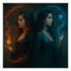 Step into a world of magic and mystery with this captivating fantasy art print, featuring two mystical women standing back-to-back, each embodying opposing elemental forces—fire and ice, sun and moon, passion and serenity. With glowing orbs and swirling energy, this powerful image symbolises balance, duality, and sacred feminine energy. Perfect for altars, witchy home decor, or spiritual gifts, this enchanting design will speak to the soul of every modern mystic, fantasy lover, and magical practitioner.