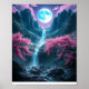 A magical digital artwork portraying a moonlit valley adorned with cherry blossom trees and cascading waterfalls. The glowing full moon lights up the dramatic mountain landscape, blending dreamlike nature with serene fantasy. Ideal for lovers of tranquil and surreal scenery.