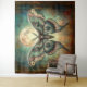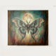 A large moth with intricate patterns on its wings is displayed prominently against a backdrop of a full moon. The moth's wings are predominantly teal and grey with hints of pink, while the moon is a pale yellow. The background features a swirling pattern in muted greens and blues, reminiscent of a night sky.  The moth itself has multiple eyespots on its wings, creating a mystical and captivating image.