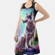 This stunning wolf artwork features a majestic wolf, sitting atop a rocky mountain, with a backdrop of a beautiful, star-filled night sky.