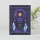 Mystic Sun Event Invitation featuring a mystical design inspired by astrology, esoteric, occult, and mysterious elements. This design has hues of blue, purple, and orange, a starry background, crystals, constellations, a sun with a face and moon phases. Design can be customised for all types of events including Bridal Showers, Weddings, Birthdays, Engagements, Anniversaries, Bachelorette Party, Graduation, Baby Showers, Retirement, House Warming and other Parties. Includes a template for personal customisation.